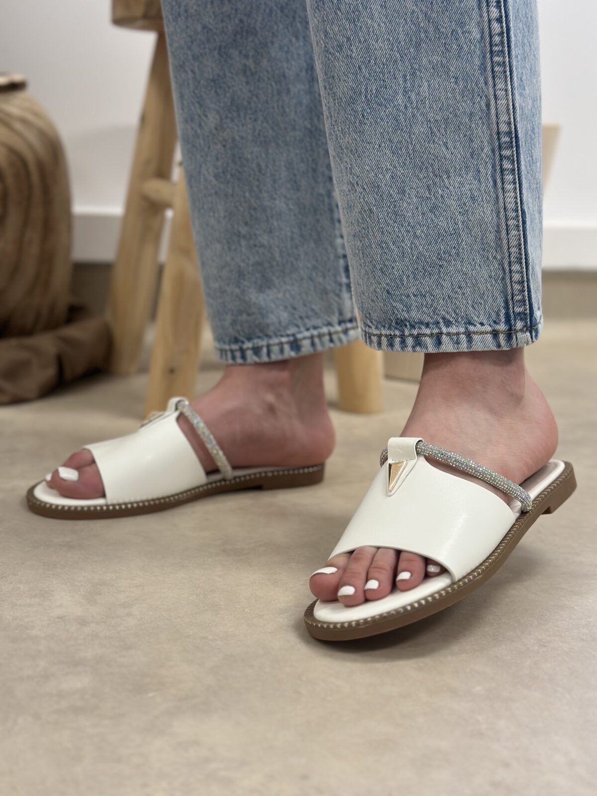 Białe klapki damskie na płaskiej podeszwie Uvano White – połysk, wygoda i elegancki detal na lato