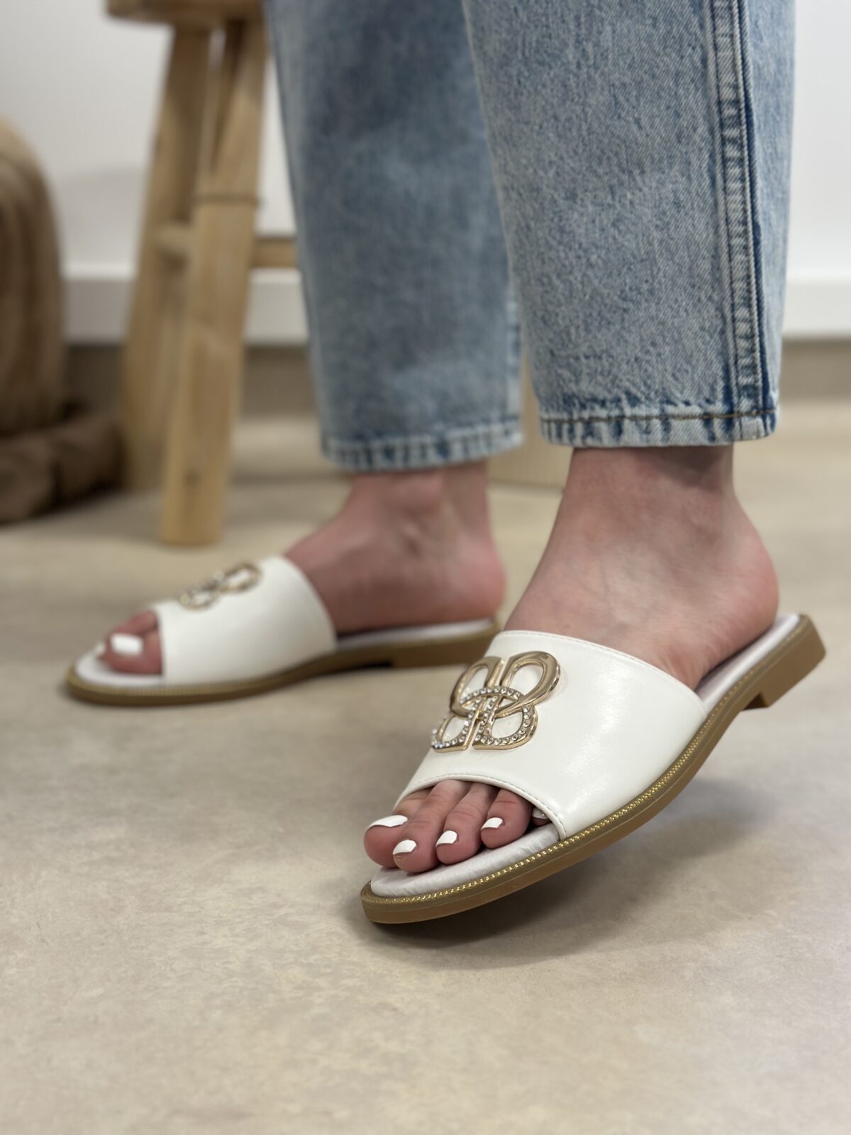 Białe klapki z ozdobną wstawką Bashiona – połączenie minimalizmu i subtelnego blasku